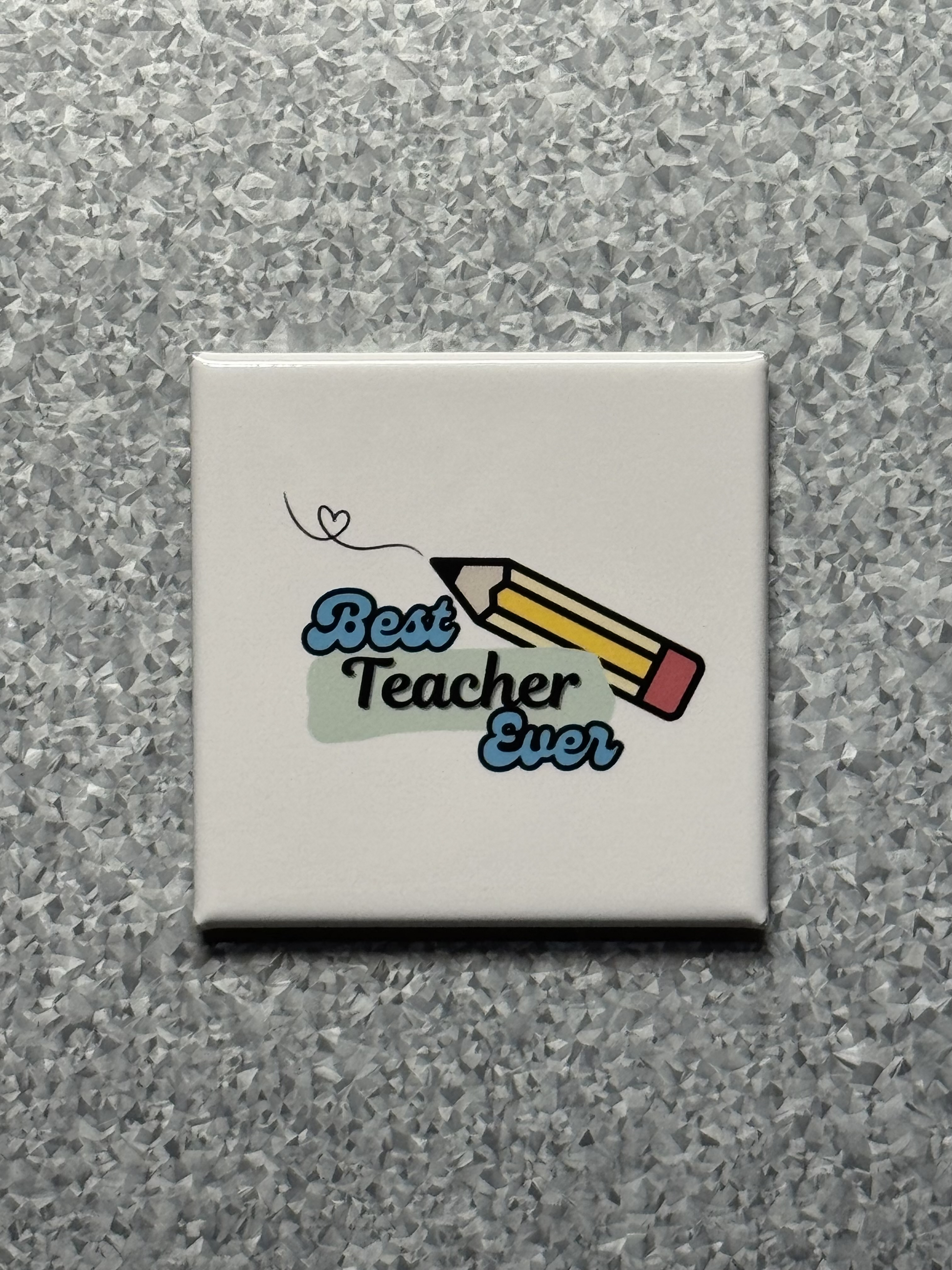 Featuring a cute pencil design and a sweet heart doodle, this 2"x2" magnet says it all: Best. Teacher. Ever.