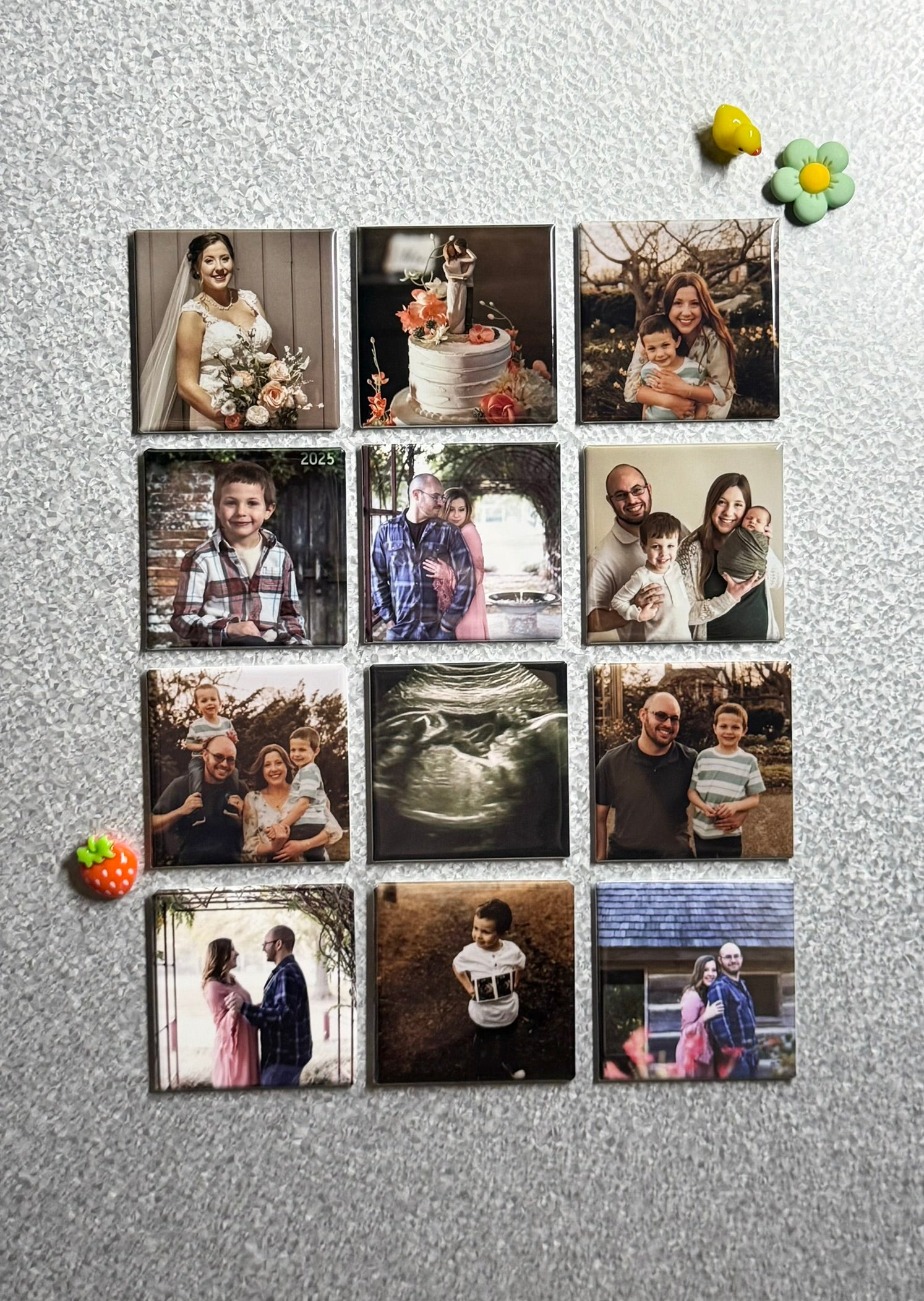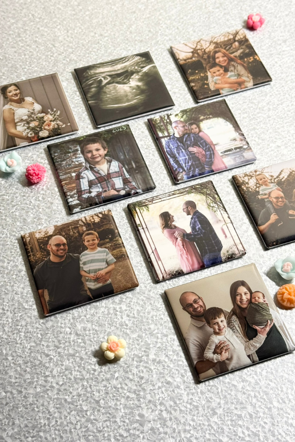 I made a set of magnets with monthly baby photos for my daughter’s first year. Now we have a little magnet timeline on the fridge—it’s adorable and such a special way to watch her grow.