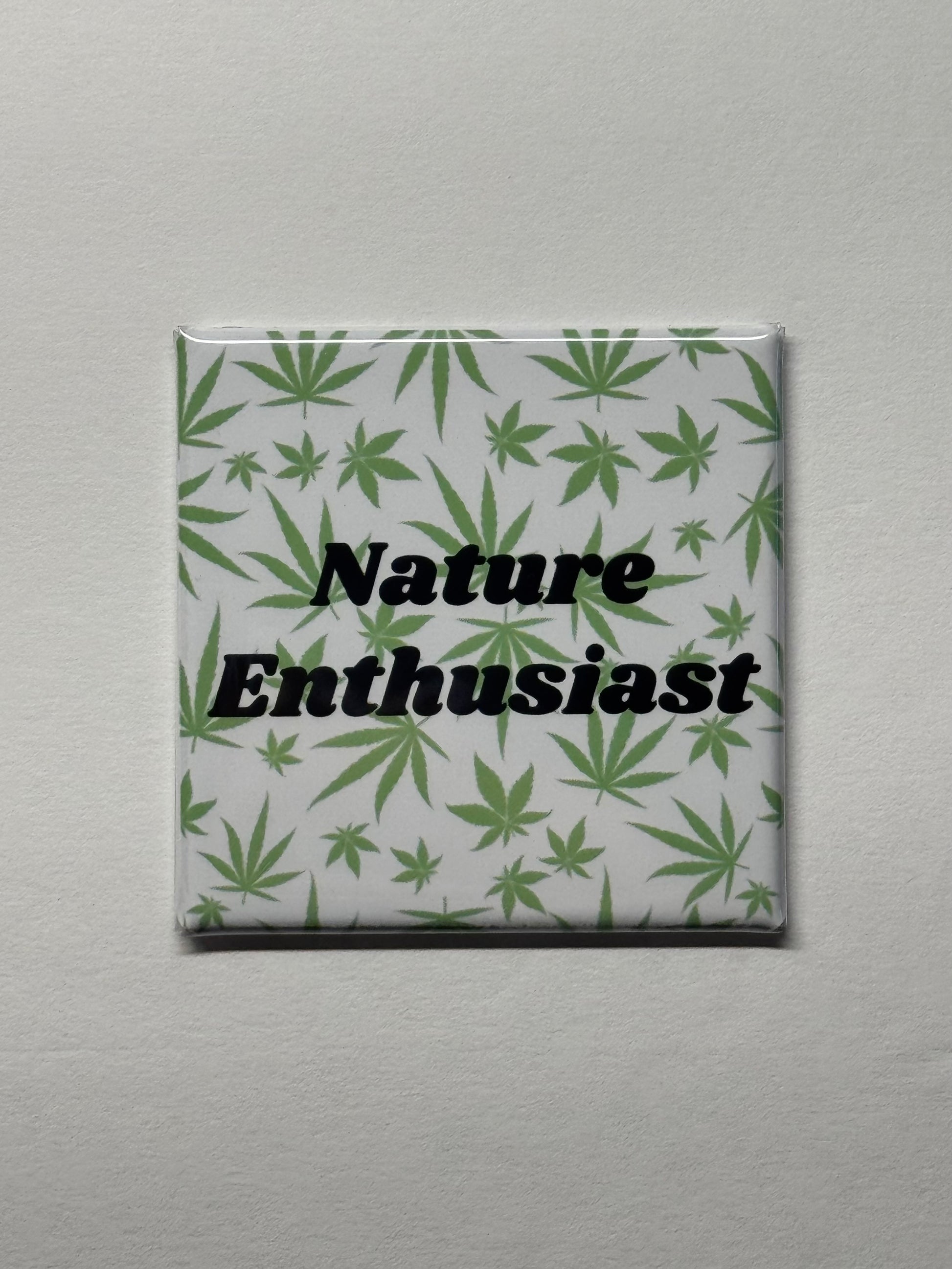 Celebrate your laid-back lifestyle with our handcrafted 2" x 2" “Nature Enthusiast” photo magnet! Featuring a playful cannabis leaf pattern and bold black lettering, this magnet adds a fun, cheeky touch to your fridge, locker, or any magnetic surface. Whether you're a proud advocate, casual enjoyer, or just vibing with the culture, this magnet is a great way to show your appreciation for all things green. Made with high-quality photo paper and strong, lasting materials—because good vibes should always stick around.